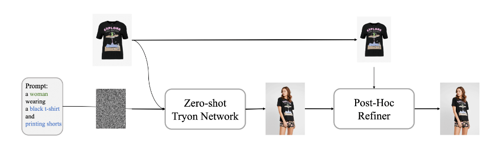Outfit Anyone은 기존의 가상 의상 착장 기술의 한계를 넘어서, 어떤 의상과 사람에게도 매우 높은 품질의 가상 착장이 가능하게 해줍니다. 이 기술은 두 가지 주요 요소로 구성돼요: 첫 번째는 'Zero-shot Try-on Network'로, 초기 가상 착장 이미지를 생성하고, 두 번째는 'Post-hoc Refiner'로, 출력 이미지의 의상과 피부 질감을 세밀하게 개선합니다.